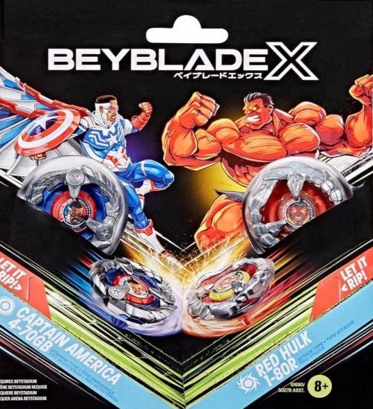 Nous vous proposons deux packs de toupies Beyblades Marvel, qui contiennent chacun deux toupies, vendues avec leurs lanceurs.